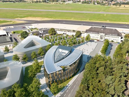 Im Atrium können zudem Veranstaltungen, Fachseminare und Tagungen mit dem Schwerpunkt Luft-, Raumfahrt und Mobilität durchgeführt werden. Das öffentlich zugängliche Atrium bietet aber nicht nur Ausstellungs- und Kommunikationsmöglichkeiten für die Nutzer und die Institutionen des Forschungsflughafens, es ist auch Ausdruck des offenen, kommunikativen Charakters des Gebäudes und seiner Nutzer. Sinnbildlich öffnet es sich mit seinem zweigeschossigen Eingangsbereich und einer transparenten, energetisch optimierten Fassade aus raumhohen Verglasungen großzügig zum Lilienthalplatz hin.